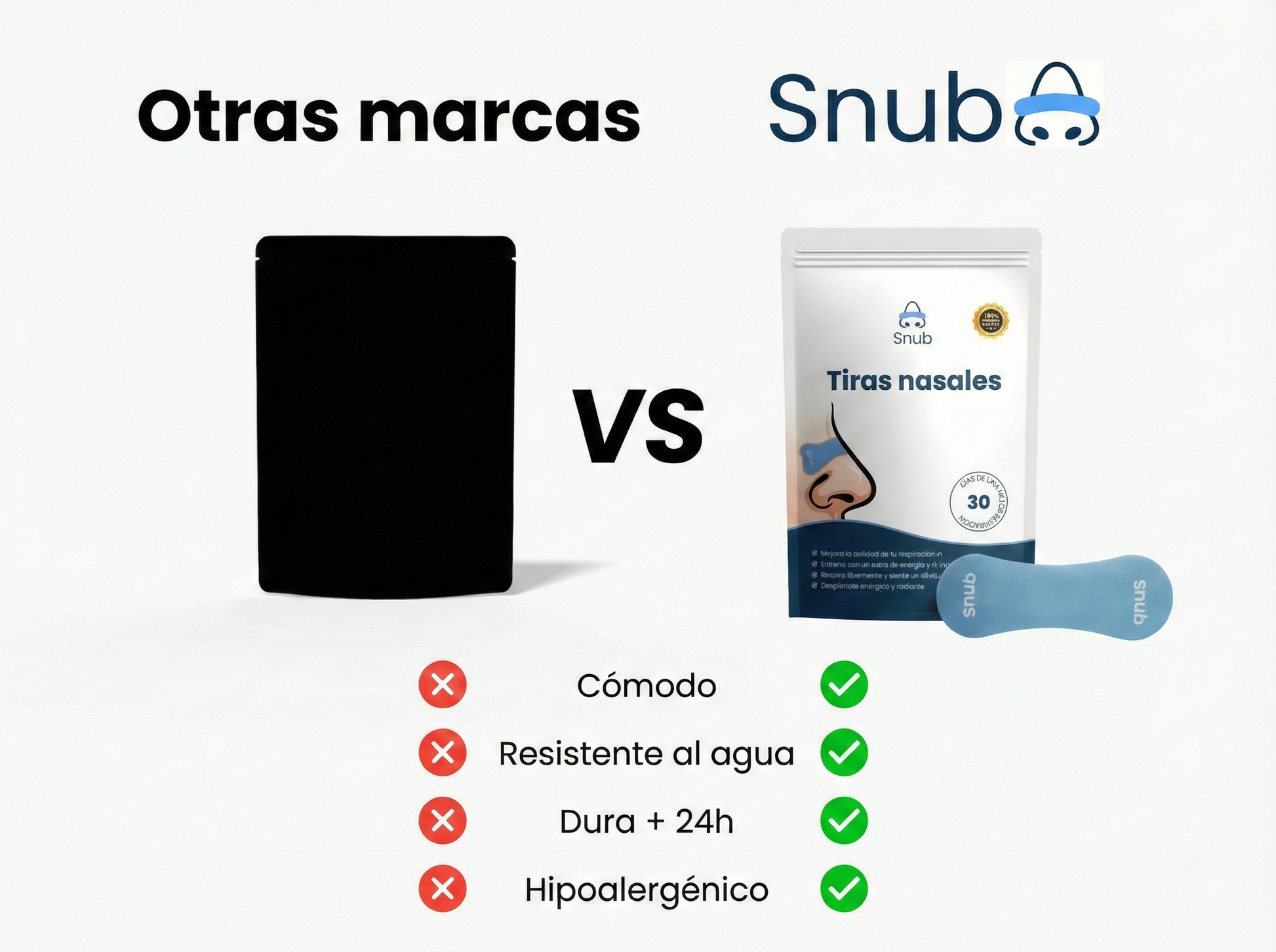 Durante el entrenamiento intenso, la respiración por la boca se apodera y la fatiga aparece rápidamente. Las tiras Snub mantienen abiertas tus vías nasales, para que puedas respirar más profundamente y mantener el control incluso cuando tu ritmo cardíaco se dispara. Un mejor flujo de aire significa un mejor rendimiento — sin esa sensación de ahogo.